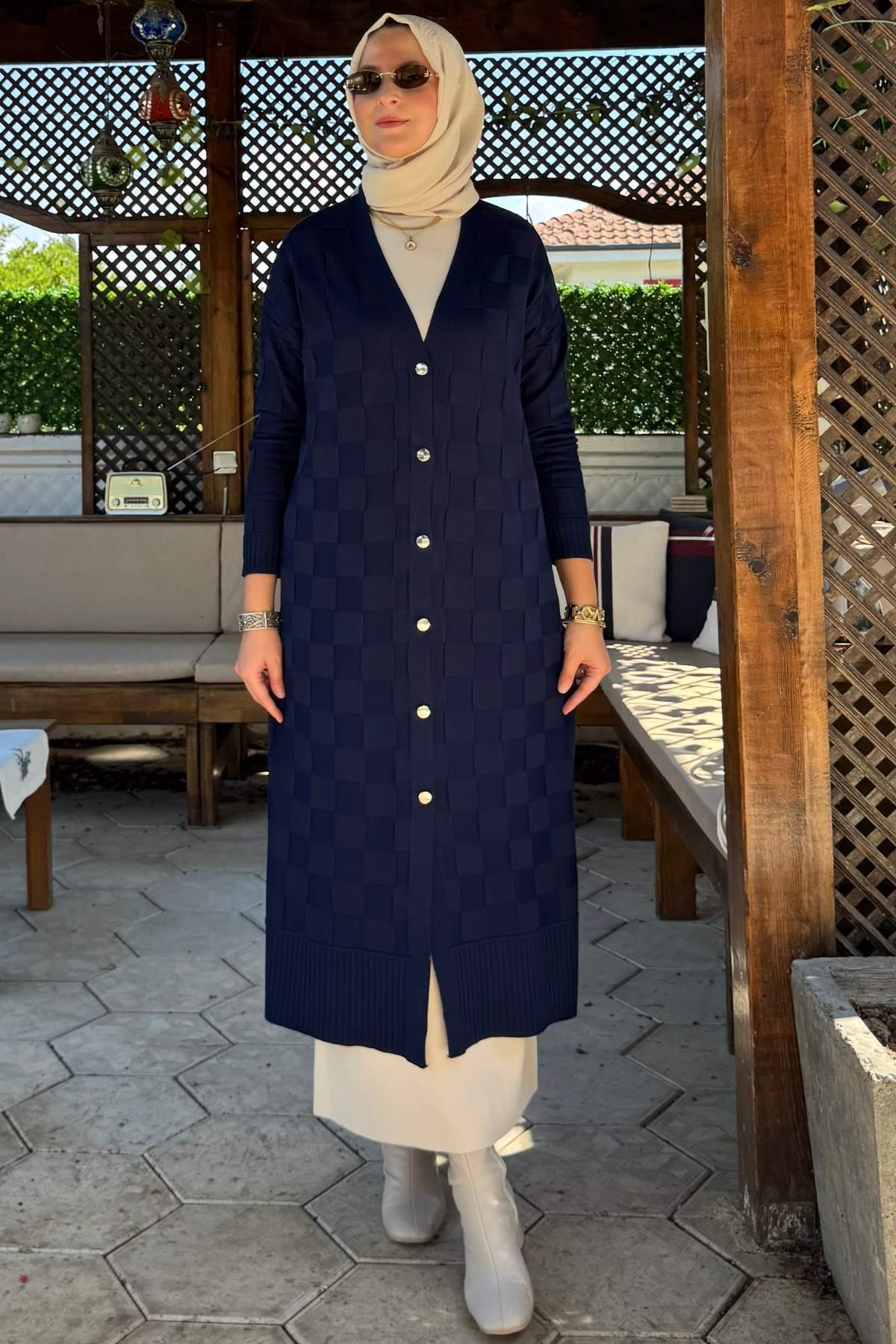 Dama Desenli Triko Hırka, modern dama deseniyle dikkat çeken şık bir tasarıma sahiptir ve tesettür giyim kombinlerine zarif bir hava katar. Merserize dokulu yapısı sayesinde hafif, rahat ve kaliteli bir kullanım sunarken, standart beden (36-44 uyumlu) kalıbıyla konforlu bir giyim deneyimi sağlar. 120 cm uzunluğuyla hem günlük hayatta hem de özel davetlerde şıklığınızı ön plana çıkaracak bu triko hırka, dama deseninin zamansız şıklığıyla gardırobunuzun favori parçaları arasında yerini alır.