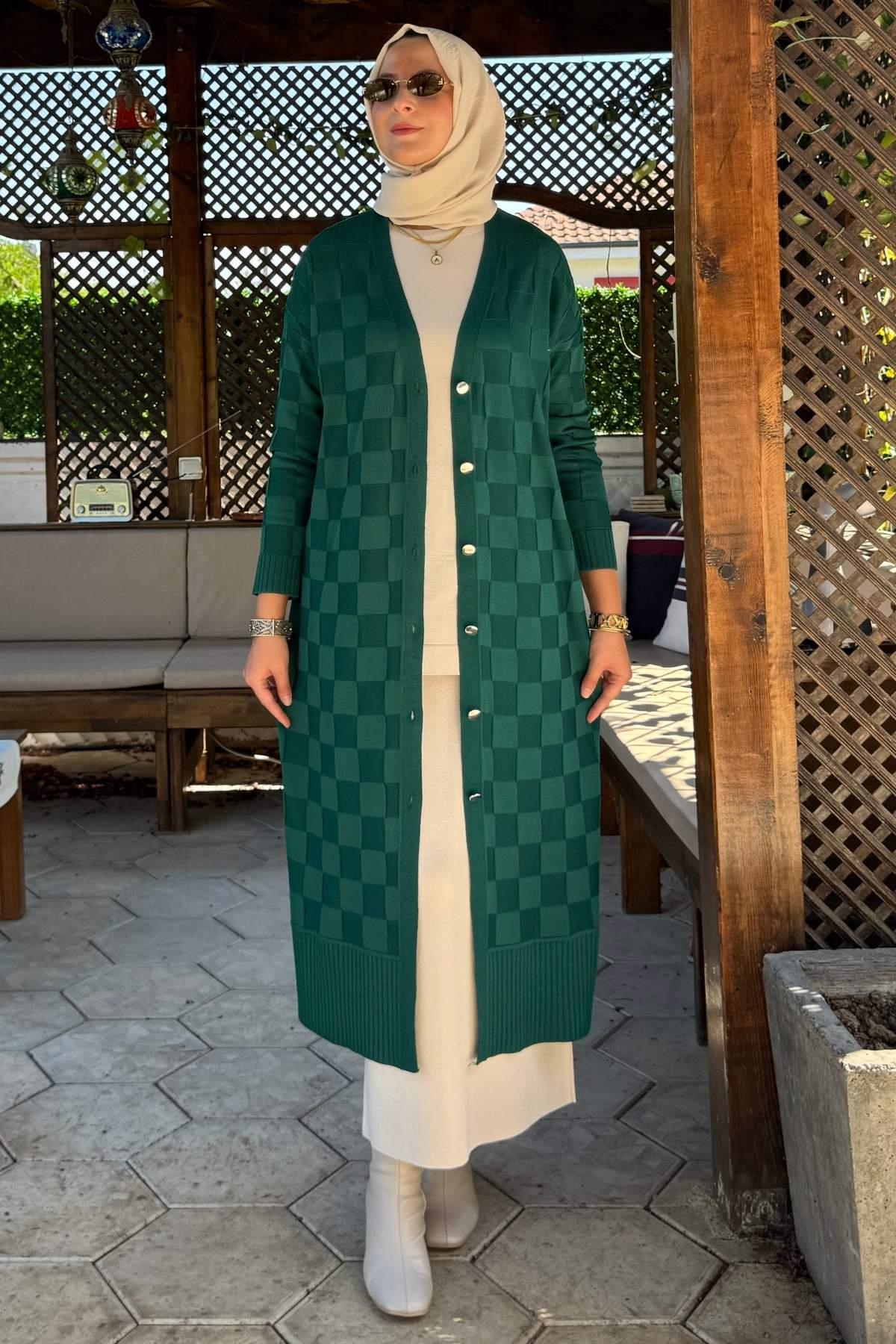 Dama Desenli Triko Hırka, modern dama deseniyle dikkat çeken şık bir tasarıma sahiptir ve tesettür giyim kombinlerine zarif bir hava katar. Merserize dokulu yapısı sayesinde hafif, rahat ve kaliteli bir kullanım sunarken, standart beden (36-44 uyumlu) kalıbıyla konforlu bir giyim deneyimi sağlar. 120 cm uzunluğuyla hem günlük hayatta hem de özel davetlerde şıklığınızı ön plana çıkaracak bu triko hırka, dama deseninin zamansız şıklığıyla gardırobunuzun favori parçaları arasında yerini alır.