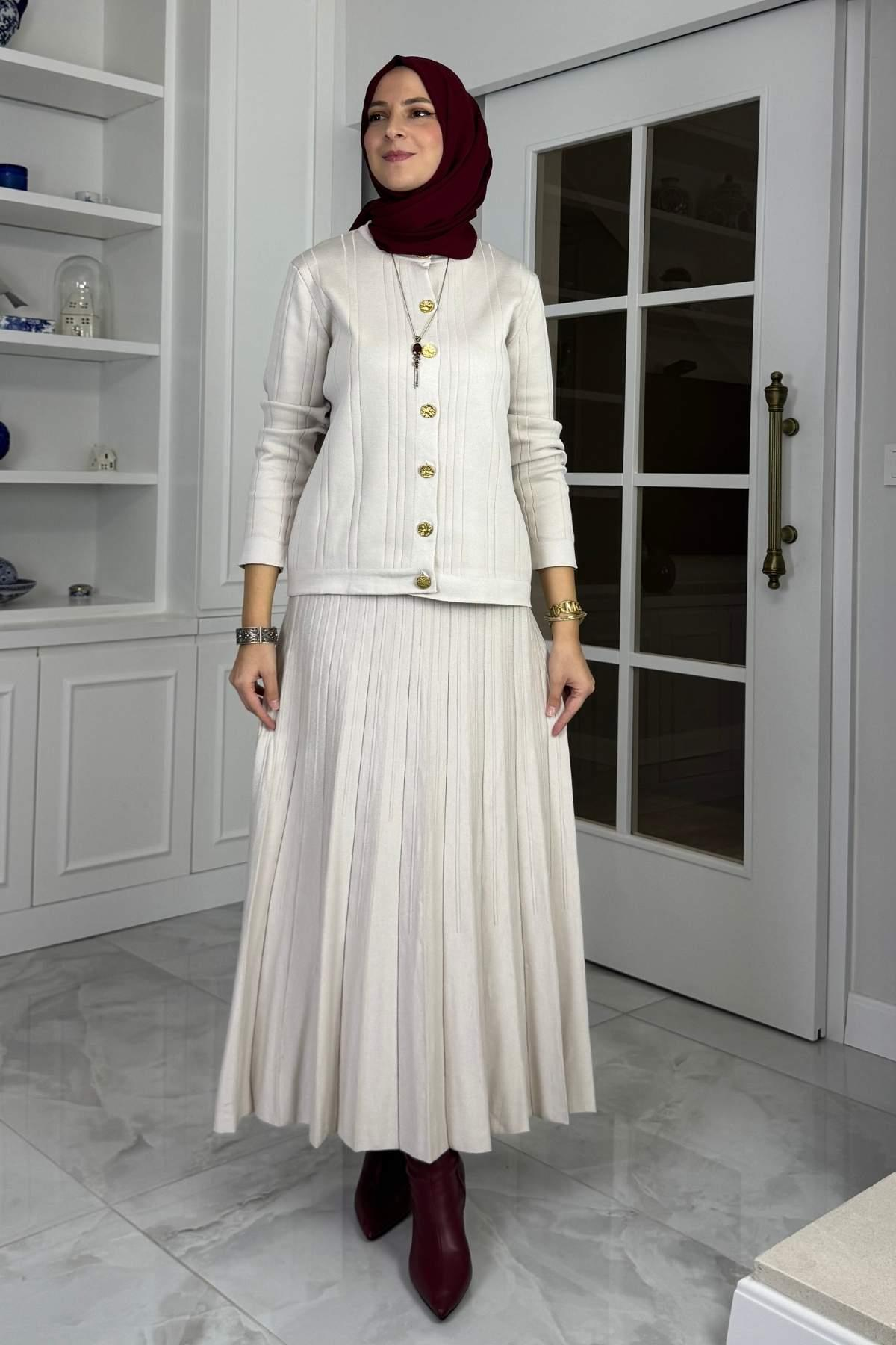 Defne Çelik Örme Triko Takım, zarif çelik örme dokusu ve modern pileli etek tasarımıyla tesettür giyim şıklığını ön plana çıkarıyor. Merserize dokulu yapısı sayesinde hafif, esnek ve kaliteli bir kullanım sunan bu triko takım, 36-44 beden aralığına uyumlu formuyla konforlu bir giyim deneyimi sağlar. Hem günlük kombinlerde hem de özel davetlerde tercih edilebilecek şık bir seçenek olan bu tesettür takım, pile detaylı eteği ve modern tasarımıyla gardırobunuzun en göz alıcı parçalarından biri olacak.