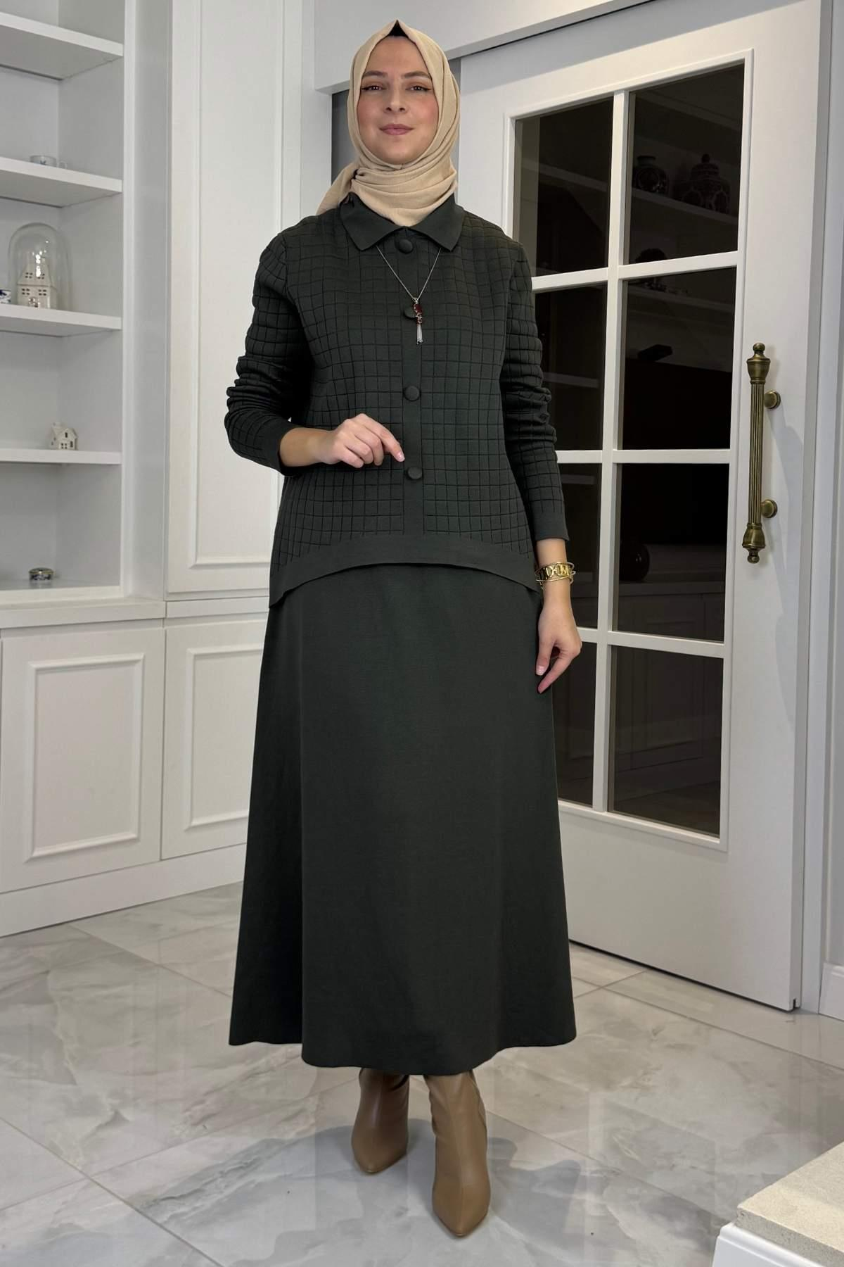 Kumsal Triko Takım, modern kare deseniyle dikkat çeken şık bir tasarıma sahiptir ve tesettür giyim kombinlerine zarif bir hava katar. Merserize dokulu yapısı sayesinde hafif, rahat ve kaliteli bir kullanım sunan bu triko takım, 36-46 beden aralığına uyumlu formuyla konforlu bir giyim deneyimi sağlar. Günlük kullanımda ve özel davetlerde şıklığınızı ön plana çıkaracak bu tesettür takım, gardırobunuzun vazgeçilmez parçalarından biri olacak.