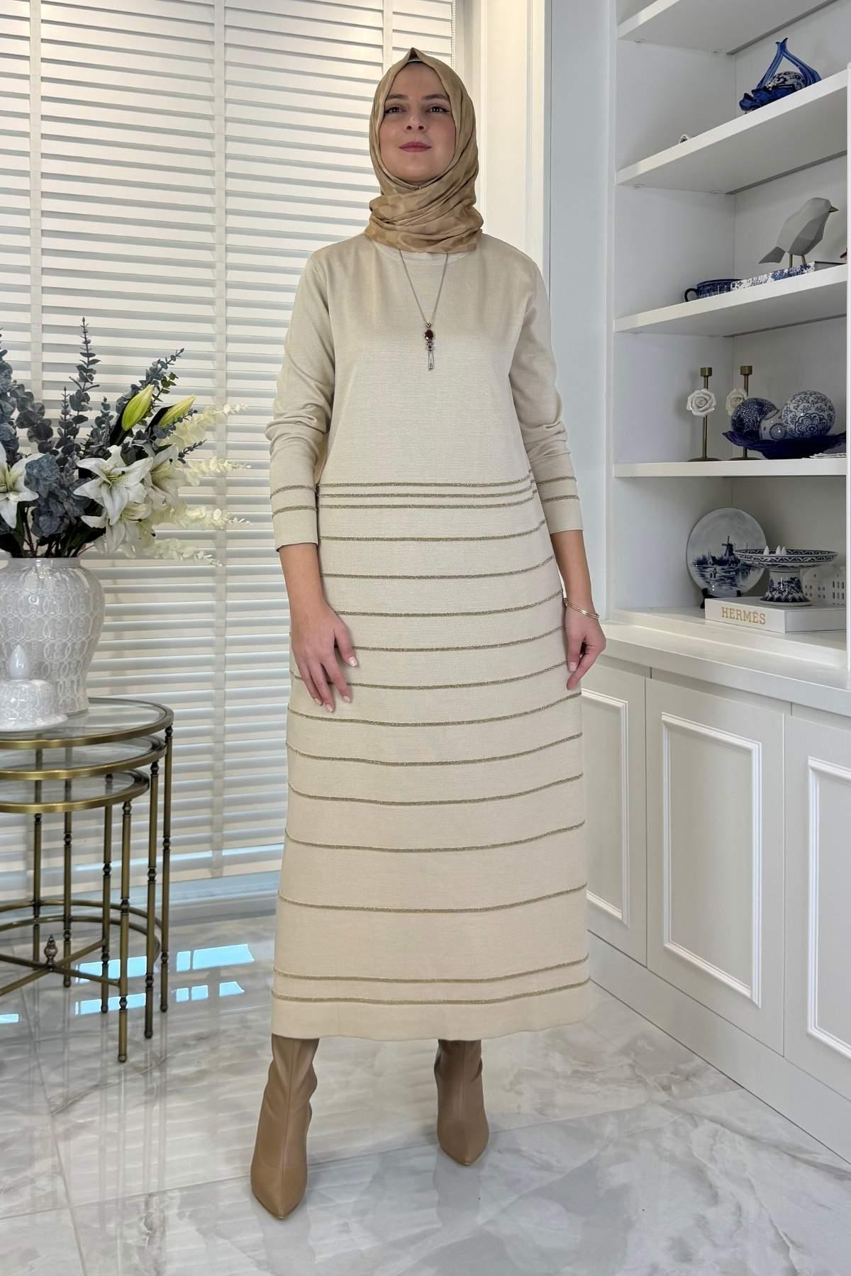 Nisan Simli Triko Elbise Sütlü Kahve | Rabia Şamlı | Tesettür Giyim, Elbise ve Kadın Giyim Modası